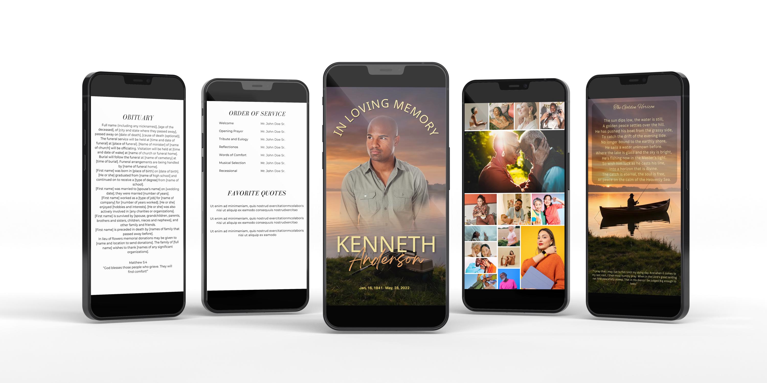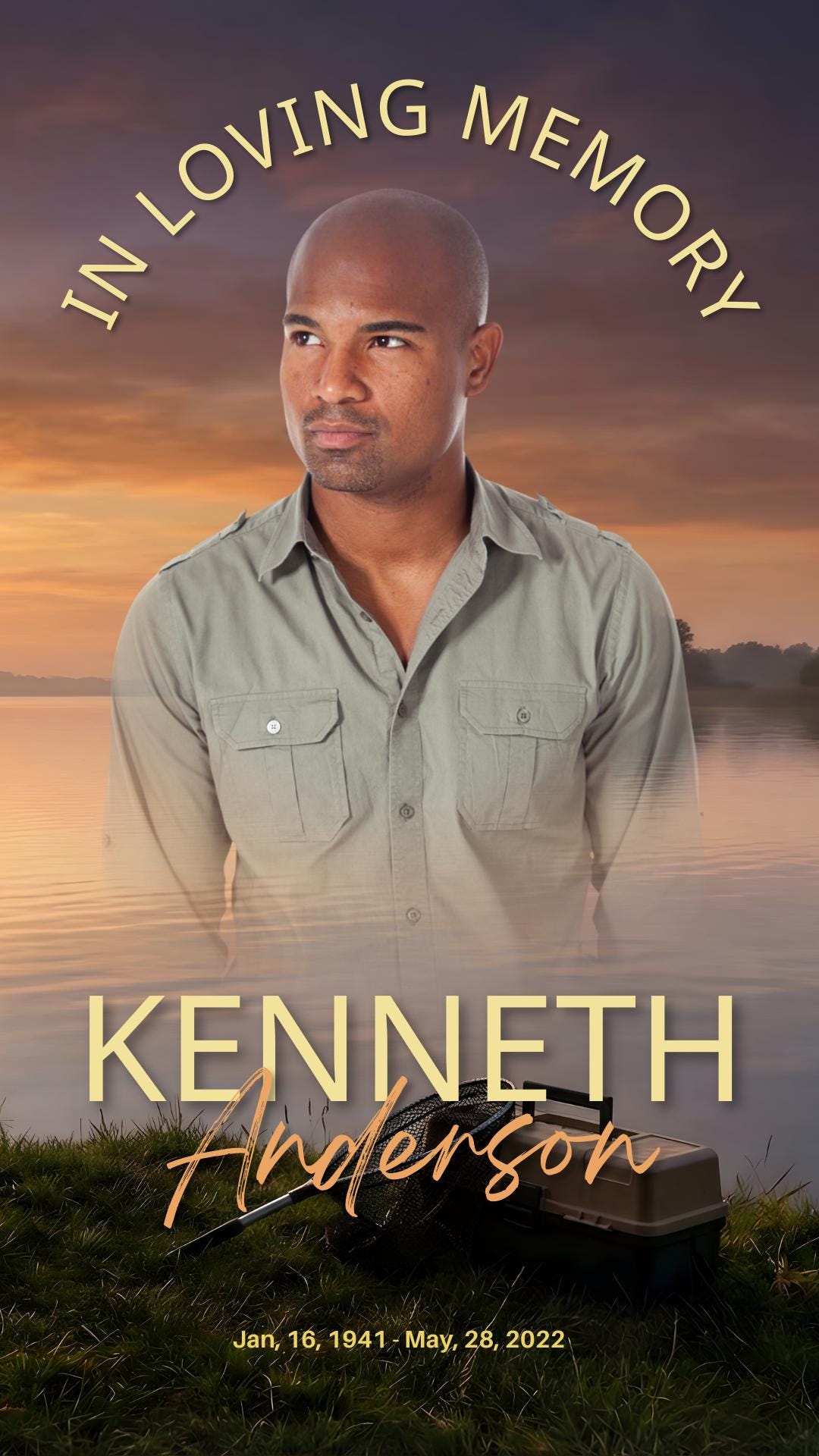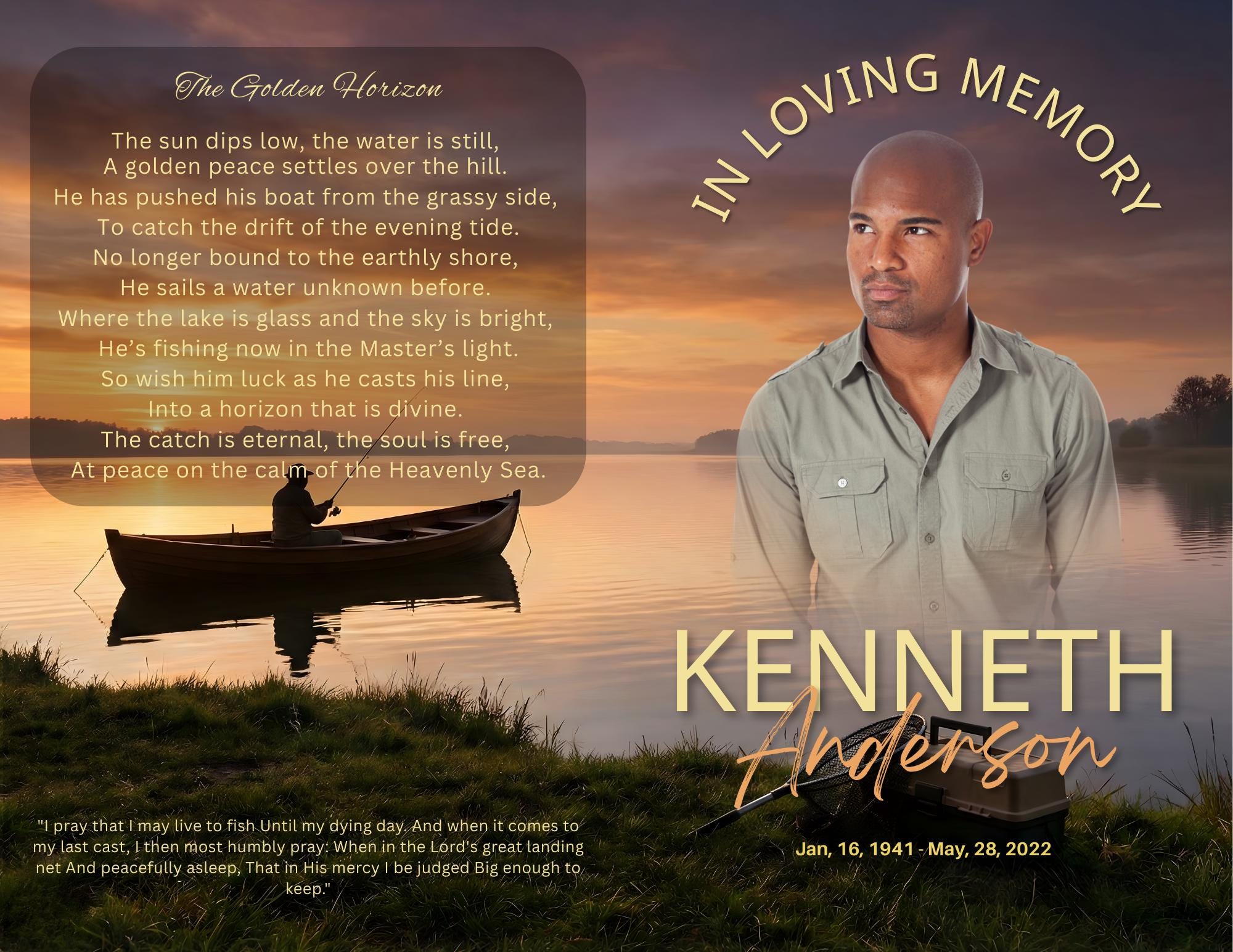 This isn't just a standard graphic. It is a heartfelt tribute designed for the fisherman, the outdoorsman, or the soul who found peace in the rhythm of the cast. The cover features a serene photorealistic digital art composition of a lone fisherman in a boat, silhouetted against a golden sunset on a calm lake. In the foreground, his tackle box and net rest on the grassy bank, capturing the quiet solitude of a perfect day on the water—sharp, lifelike, and full of memory.