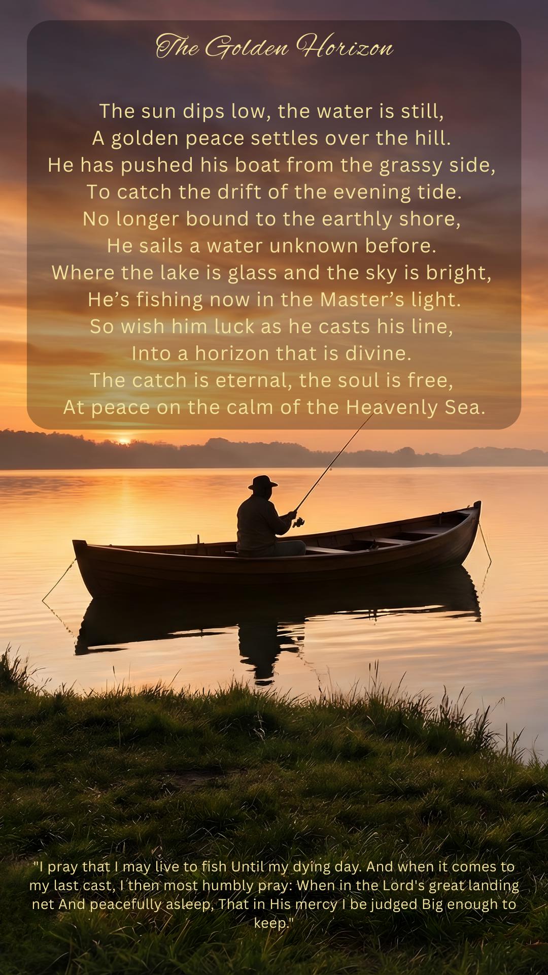 THE POETRY The back cover features a comforting poem titled "The Golden Horizon," written to honor the fisherman who has cast off into fairer waters one last time.