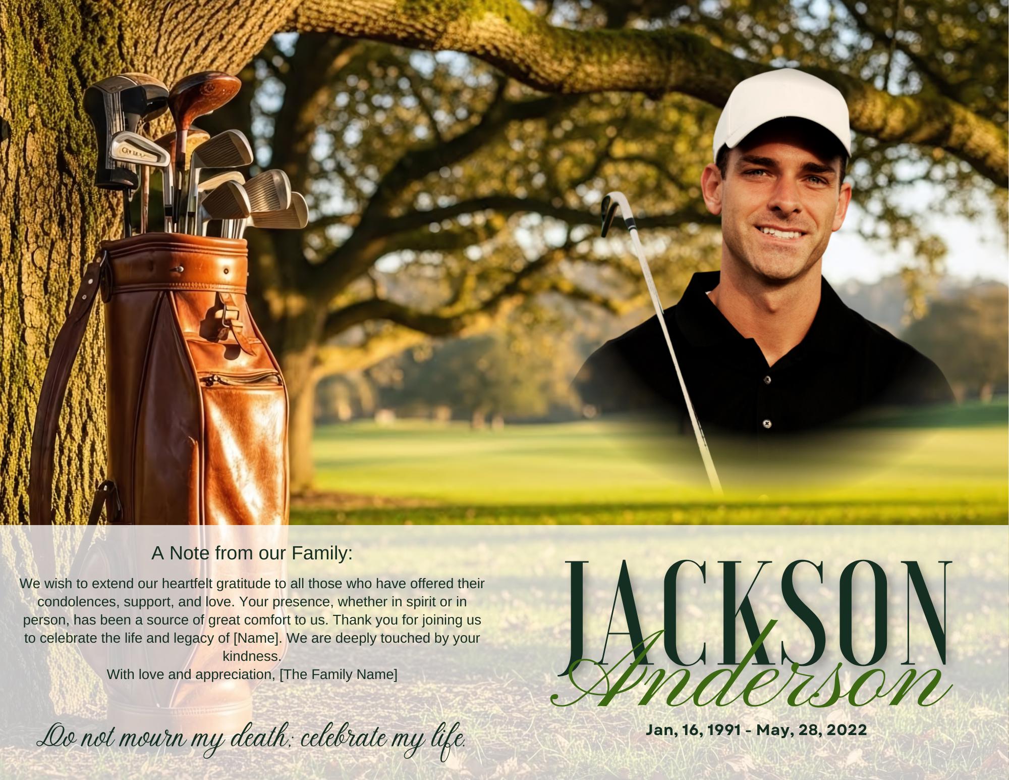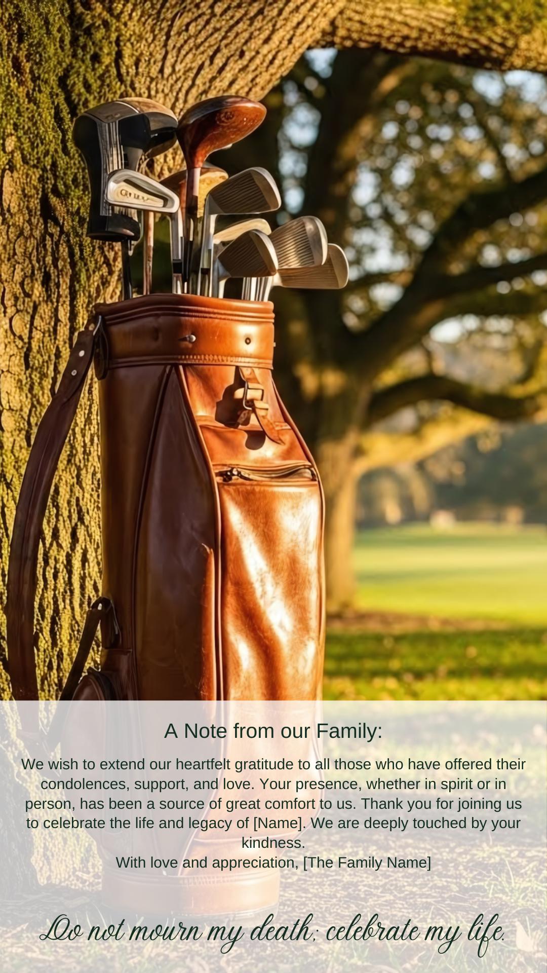 This isn't just a standard graphic. It is a heartfelt tribute designed for the golfer, the sportsman, or the soul who found their peace on the fairway. The cover features a stunning photorealistic digital art composition of a vintage leather golf bag resting against an old oak tree, bathed in the golden light of a setting sun. I designed this image to capture the quiet satisfaction of a perfect round coming to an end—sharp, lifelike, and full of memory.